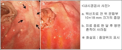 2010년 11월부터 지난 2011년 4월까지 7차례 수지상세포 백신 박셀을 투여하고 한 달 후 내시경 검사결과 병변의 흔적이 없어졌고 조직검사 결과는 정상이었다. 후에도 약 3년간 추적관리를 했지만 치료효과는 지속됐다.